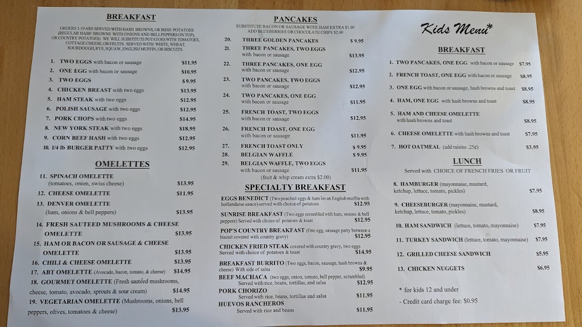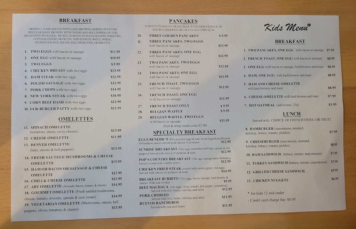- Specialty Breakfast: This section includes dishes such as Eggs Benedict, Sunrise Breakfast (scrambled eggs with ham, onions, and bell peppers), Pop's Country Breakfast (egg and sausage patty with biscuits and gravy), and Chicken Fried Steak. These meals typically come with a choice of potatoes or toast and are designed for a full, satisfying breakfast experience.